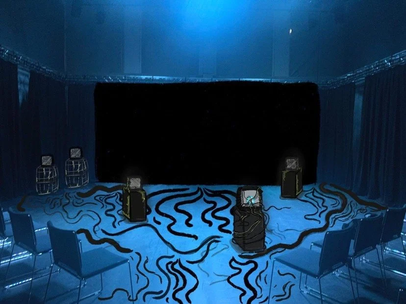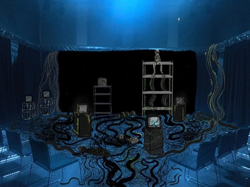 Another issue we later had was sight lines - especially after the seating configuration was changed from being at a diagonal to being straight on. Kevin commented saying that he’d like the TVs incorporated into the space more as opposed to just being at the front and we had also received feedback that the TVs were set too low on the ground to be visible. Our original design had included rostrum so we went back to that and additionally placed the TVs near “action points” the audience would already be drawn to during the piece - creating more dynamic levels with our set in the process. We put Alicia’s live stream TV and 2 CRT monitors on one, Jake’s piano and another CRT. We moved another CRT so it would be on Chris’ desk, raising the sight level.