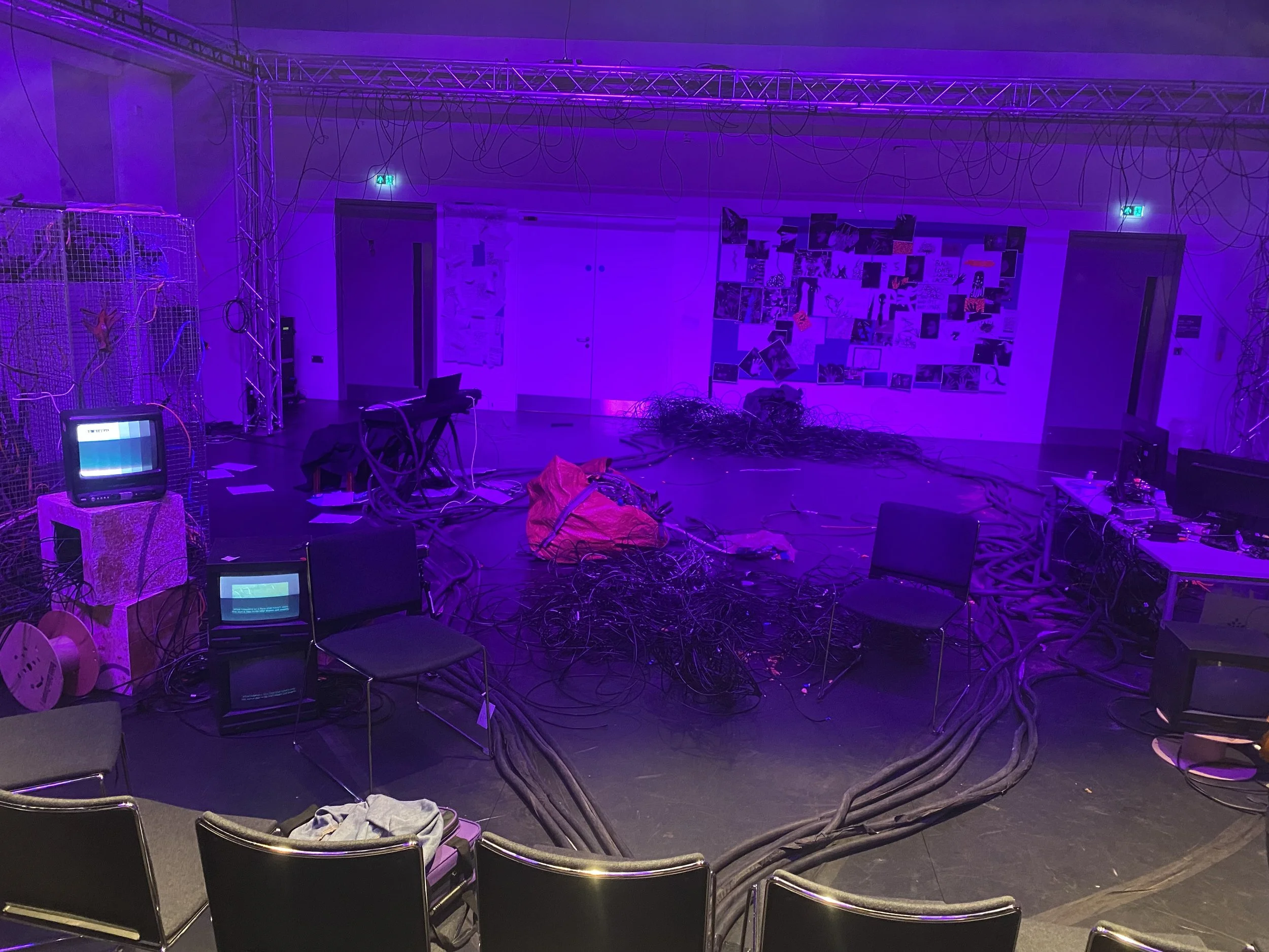 Quite early on, we had decided as a group to do something with wires after a discussion with Kevin. I had been using CRT monitors in my exhibition and I like exploring nostalgic aesthetics in my work so was drawn to that when we wanted TVs to show the films - I found it especially relevant since we were setting it in a wire filled wasteland which I think would have benefitted with having “obsolete” and dated technology in the sea of wires.